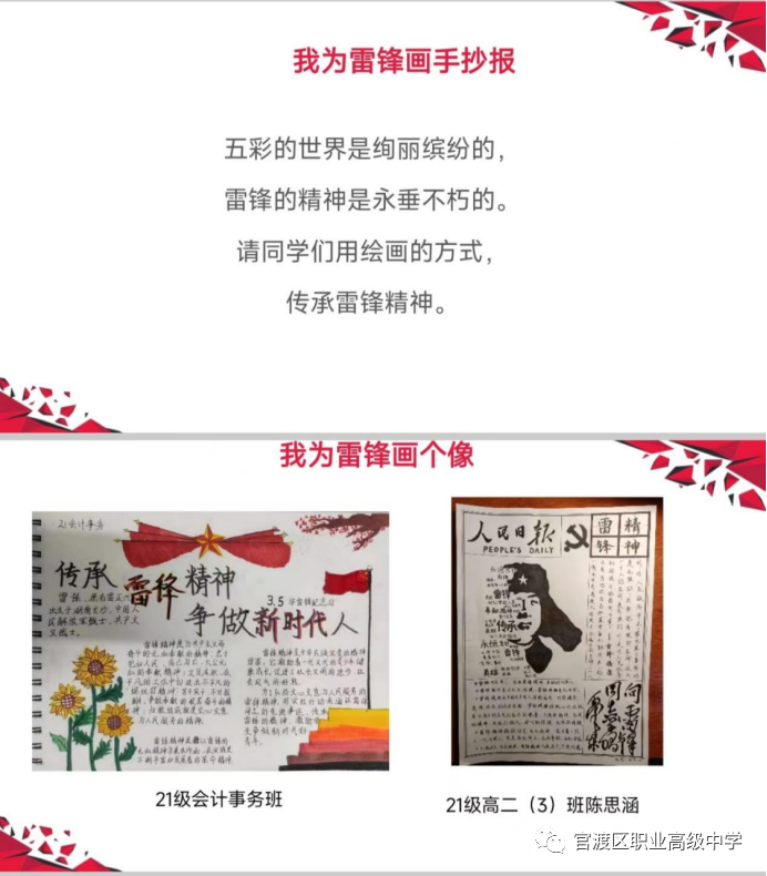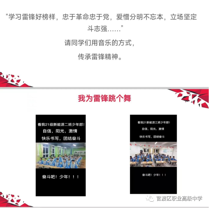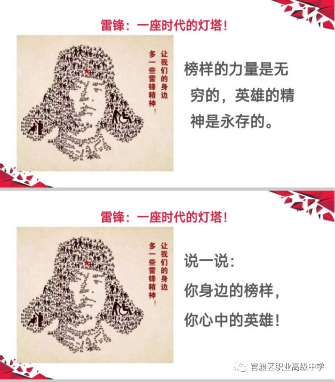 讨论结束后,陈老师展示了由校团委统筹部署,各学部积极响应,组织开展的形式多样、内容丰富、意义深刻“学雷锋”主题团日系列活动照片。照片里,官职学子通过继承发扬“雷锋”精神,提升了帮助他人、服务社会的奉献意识,更营造了积极向上、乐于助人的校园氛围。这就是雷锋精神——中华民族传统美德的集中体现,闪耀着共产主义思想的光辉,也反映了社会主义新人的精神风貌和时代特征。几十年来,雷锋精神鼓舞和激励着一代又一代的青少年不断茁壮成长。