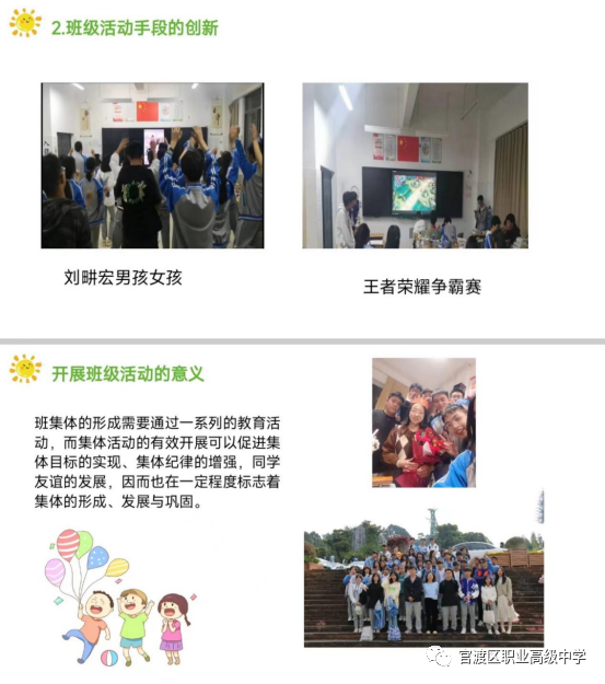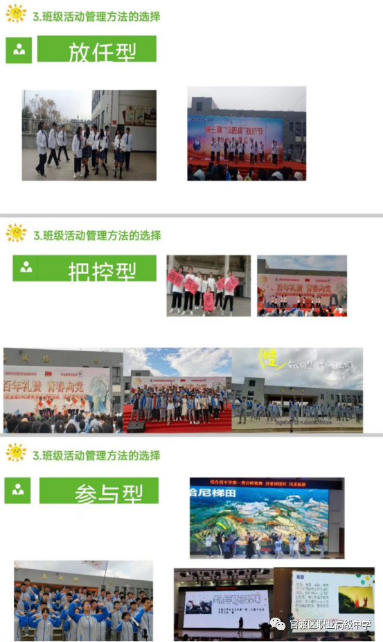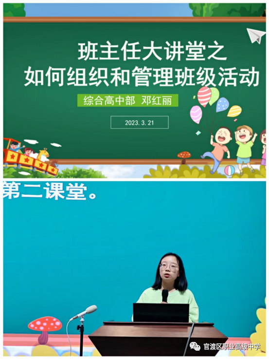 综合高中学部邓红丽老师以“如何组织和管理班级活动”为题,向大家分享自己开展班级活动的经验。邓老师表示:活动是密切师生之间、生生之间关系的桥梁,活动是班集体建设的最好载体,通过策划、组织和开展活动可以凝聚人心、创建优秀班集体。对活动的理解我们要打开思路,除了要积极参与学校组织各类活动外,自己也要组织各种常态性的活动。