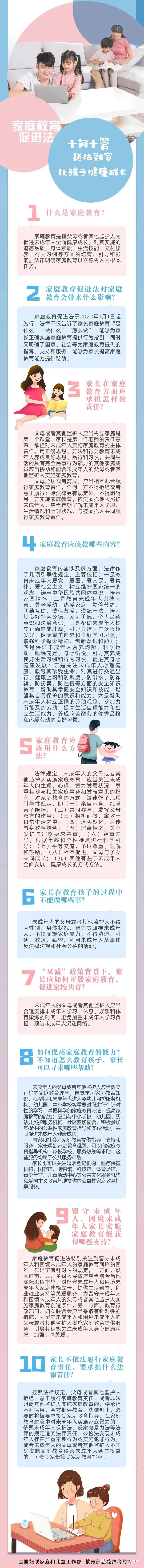 家庭是人生的第一所学校,父母是孩子的第一任老师,做父母也是一门必修课程。我国于2022年1月1日正式实施的《中华人民共和国家庭教育促进法》意味着今后家长们将迈入“依法带娃”时代。让我们通过学习《家庭教育促进法》,家校共建,共伴孩子健康成长。