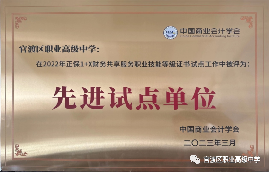 由中国商业会计学会组织的2022年正保1+X财务共享服务职业技能等级证书试点工作考核中,我校再获“2022年正保1+X财务共享服务职业技能等级证书试点工作先进试点单位”,我校路小军校长获得“2022年正保1+X财务共享服务职业技能等级证书试点工作全国卓越成就奖“,我校教师朱海宁同志获得“2022年正保1+X财务共享服务职业技能等级证书试点工作优秀指导奖”,我校教师杨燕副校长获得“2022年正保1+X财务共享服务职业技能等级证书试点工作慧心育人奖“,我校教师张红燕同志获得“2022年正保1+X财务共享服务职业技能等级证书试点工作慧心育人奖“,我校教师储敏章同志”2022年正保1+X财务共享服务职业技能等级证书试点工作优秀指导奖”。