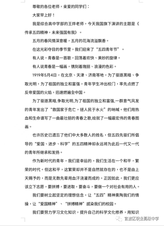 本周综合高中学部——王烨老师以《传承五四精神,未来强国有我》为题进行国旗下讲话。