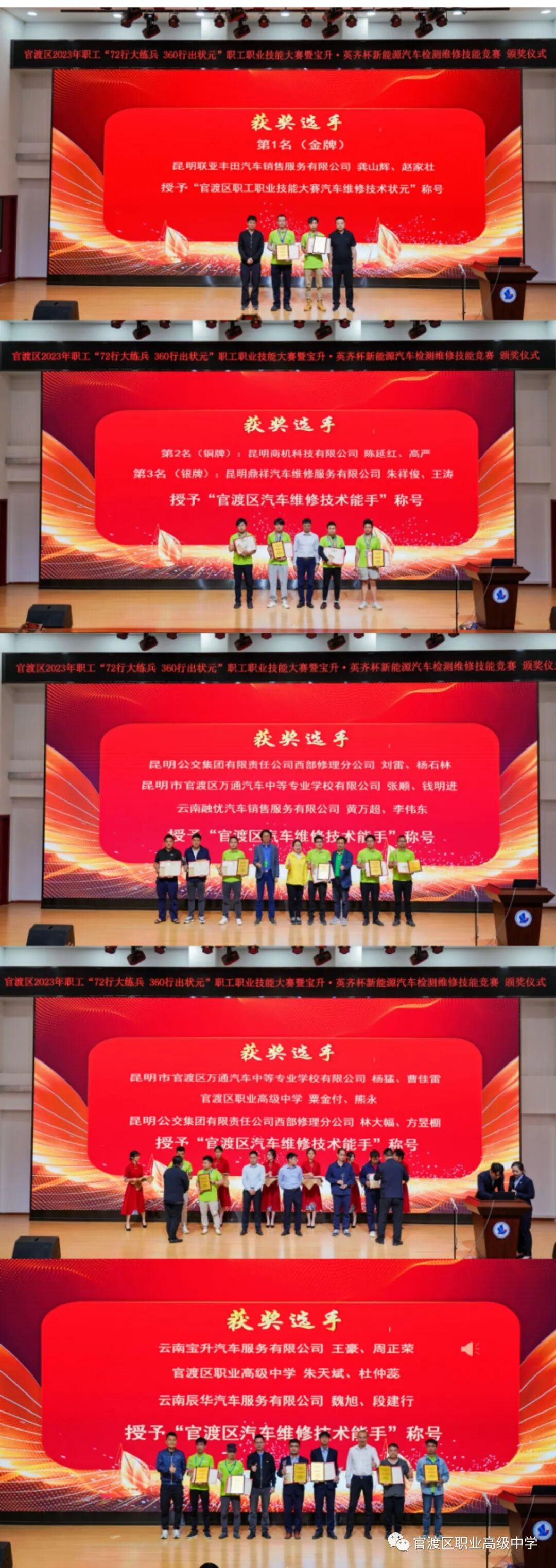 5月17日,以“匠心创造、技能强区”暨“建功’十四五’、奋进新征程,劳动创造幸福、强国复兴有我”为主题,由昆明市总工会指导,中共官渡区委组织部(区人才办)、官渡区总工会、官渡区人力资源和社会保障局、官渡区教育体育局主办的“匠心创造、技能强区”官渡区2023年职工“72行大练兵·360行出状元”职工职业技能大赛暨·英齐杯新能源汽车检测维修技能竞赛,在主办单位的指导下,在承办单位的严谨组织实施下,经过三天紧张、激烈的角逐,大赛于今天在官渡区职业高级中学圆满结束,大赛颁奖仪式在我校任之厅举行。