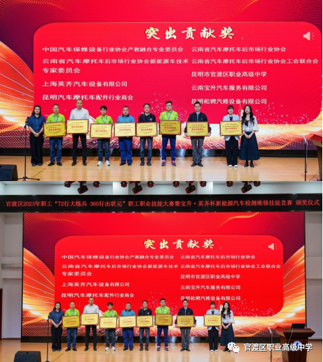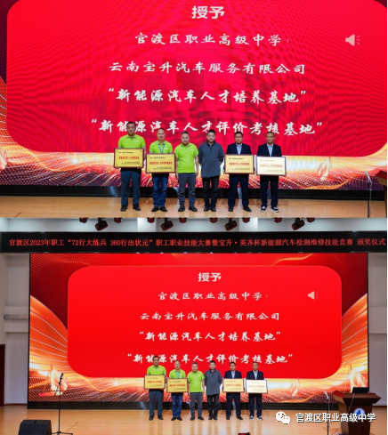 由中国汽车保修设备行业协会产教融合专委会、云南省汽车摩托车后市场行业协会新能源车技术专家委员会授予 官渡区职业高级中学、云南宝升汽车服务有限公司 新能源汽车人才培养基地、新能源汽车人才评价考核基地。园林汽修学部汽修专业教师朱熙河、李小华上台接牌。
