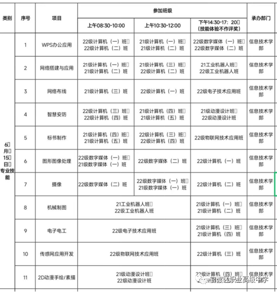 活动秉持“面向人人,接轨赛事”的原则,以“让每个学生都被‘看见’、让每项技能都有‘光彩’”为活动主题,设置专业技能(11项)、通用技能(3项)。赛后,分别评选出个人一、二、三等奖,班级评选出优秀组织奖。