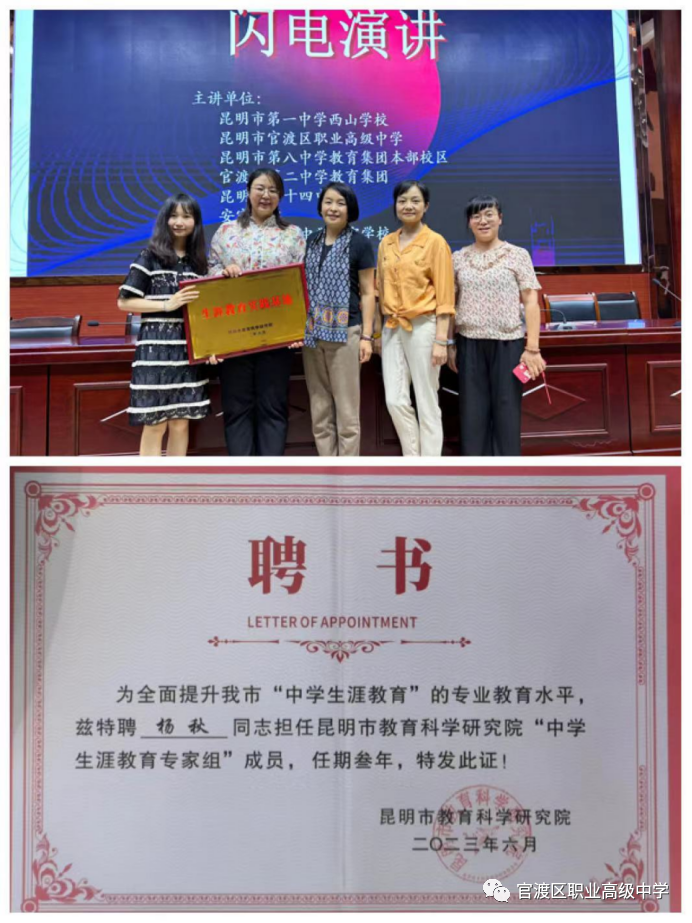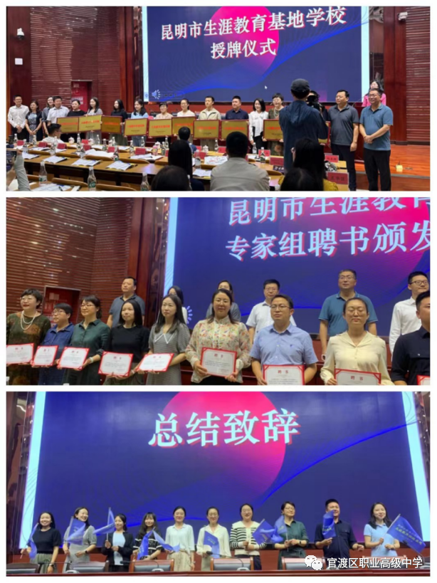 昆明市官渡区职业高级中学获评为昆明市生涯教育实践基地学校文:董颖图:董颖、计娜、杨秋审核:杨秋为响应国家教育号召,顺应国家未来教育目标,推进昆明市中学生生涯规划教育,促进教师专业化发展,昆明市教科院于2023年6月29日举办“中学生生涯教育”主题论坛活动。我校德育副校长杨秋老师,心理成长中心计娜老师、董颖老师参加了本次活动。其中,我校被昆明市教育科学研究院获评为“生涯教育实践基地”。杨秋老师被聘为“中学生涯教育专家组”成员。 在中学生生涯教育领域,我校坚持以学生职业生涯发展为导向,健全德技并修、工学结合育人机制;不断坚持“五育”并举,推行自主德育,开展“六大节”活动,实施“大德育”工程,推动“主题化”教育,形成“三全育人”典型案例,成为“云岭工匠”的成才摇篮。同时,我校不断树立以人为本的心理疏导理念, 建立全校师生心理档案,重构以人为本的心理疏导内容,开发心育课程贯彻以人为本的心理疏导方法。此外,我校构建三全育人体系、联动多方协同,建立互相协作的教育网络,促进学生健康成长。我校坚持将生涯教育工作落实在常识、常规、常态管理中,点滴浸润学生,为学生的发展保驾护航。 在生涯闪电汇报中,杨秋老师以《践行“尚长”育人理念·培育“四有”时代工匠》为主题,围绕我校职业生涯发展进行汇报,我校结合职业教育特点,提出“尚长”育人理念,把学生自信、自立、自强作为人才培养的主要目标,创设释放学生潜能、多元发展的良好教育环境,努力培养“心中有国、手中有能、脑中有诚、行中有魂”的“四有”官职学子。其中实践路径可以总结为四句话:“课程建设是我们的基石,德育活动是我们的灵魂,校企合作是我们的关键,服务引领是我们的使命。 开展生涯规划教育,既是学生自身健康成长的需要,也是社会发展对人的素质要求的需要。希望在官渡职中的教育沃土里,能培养健全的人格,发展人的潜能,使学校的生涯规划教育从真正意义上达到以人为本,促进师生健康和谐发展。学校将以此次评选为昆明市生涯教育实践基地为契机,继续探索并创生涯教育的发展,为维护和发展全校师生的健康心理和生涯发展提供更好的支持和帮助。。编辑|胡浩东 1END