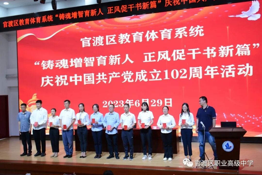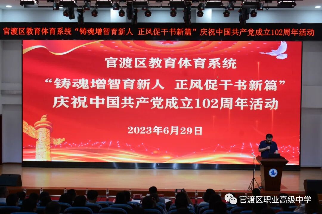 为深入贯彻落实党的二十大精神和习近平总书记系列重要讲话精神,隆重纪念中国共产党成立102周年,动员和激励全区教育体育系统各级党组织和广大党员,把思想和行动统一到上级党委、政府的要求和部署上来,推进官渡教育体育高质量发展。官渡区教育体育系统“铸魂增智育新人 正风促干书新篇”庆祝中国共产党成立102周年活动在我校举行。