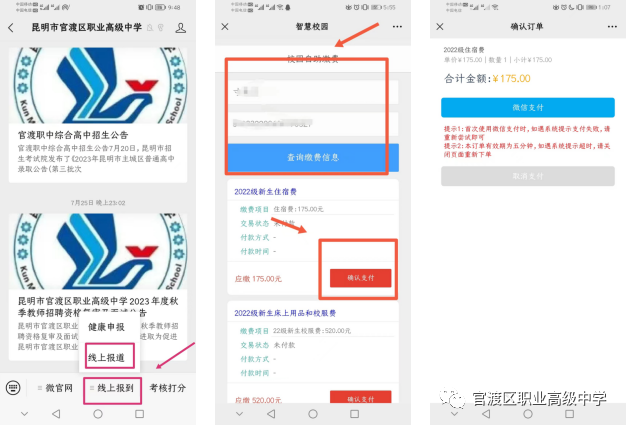 你们好!本学期昆明市官渡区职业高级中学线上缴费仅通过学校微信公众号进行。本次新生报到,学校不会发送短信要求您点击链接或扫描二维码进行操作。