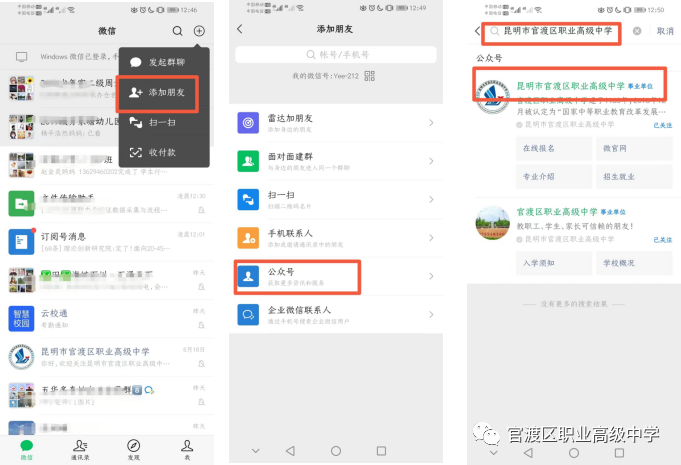 打开微信,点击右上角+,点击添加朋友,点击公众号,输入昆明市官渡区职业高级中学,点击关注。