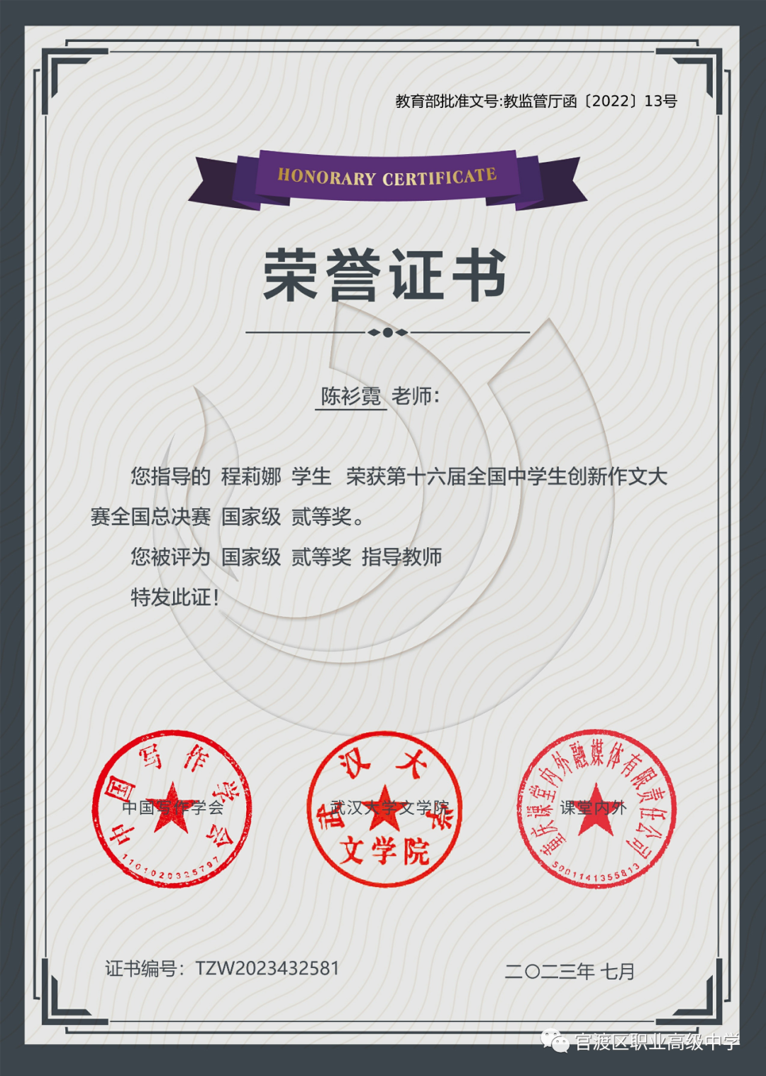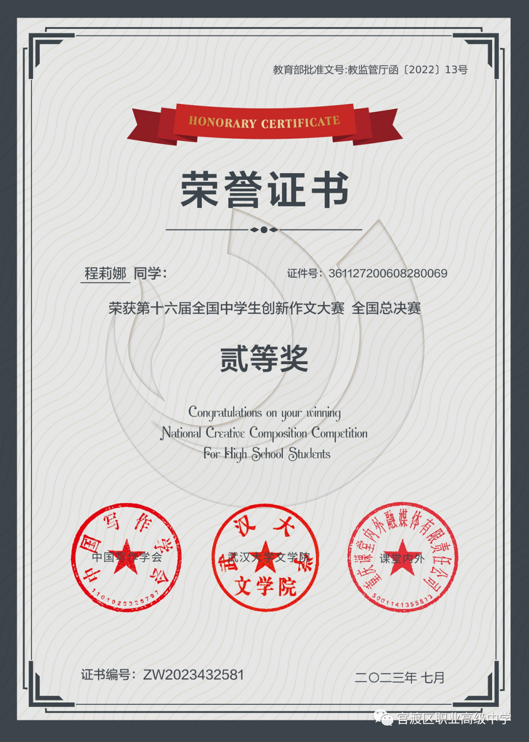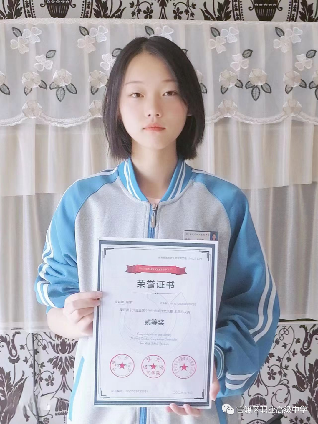 我校综合高中学部程莉娜同学荣获第十六届全国中学生创新作文大赛二等奖
