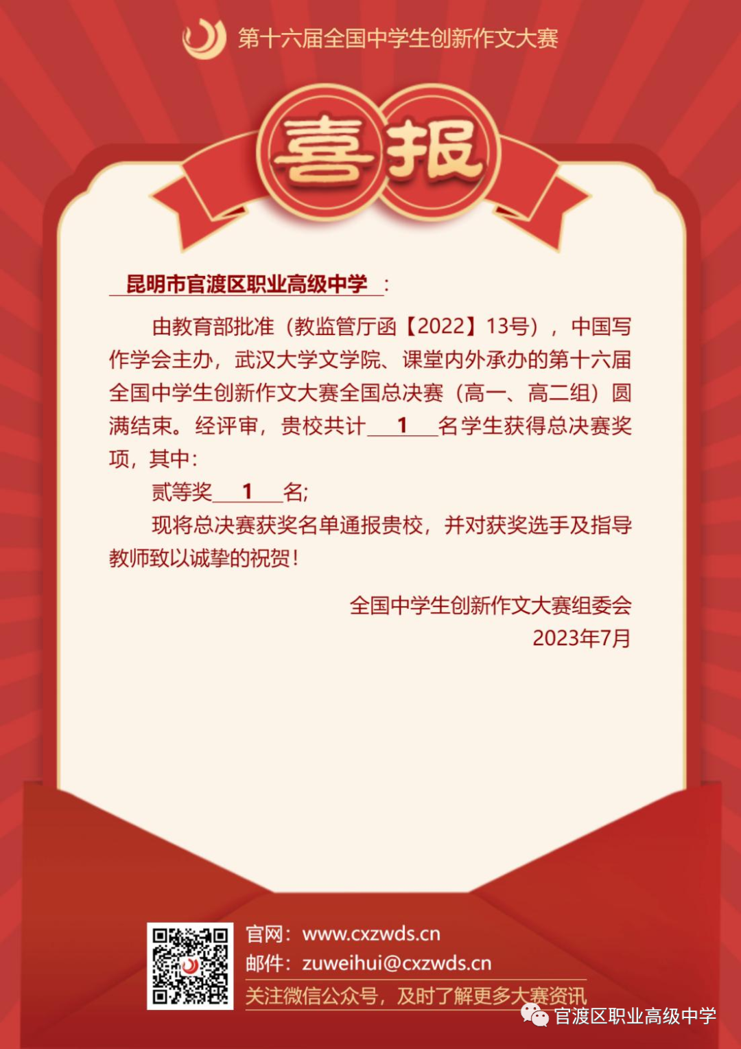 日前,以“写下即永恒”为主题的第十六届全国中学生创新作文大赛总决赛在山东济南落幕。我校综合高中学部高一(4)班的程莉娜同学经过层层选拔,以云南省初赛一等奖,云南省决赛一等奖的好成绩晋级全国决赛并荣获全国二等奖。