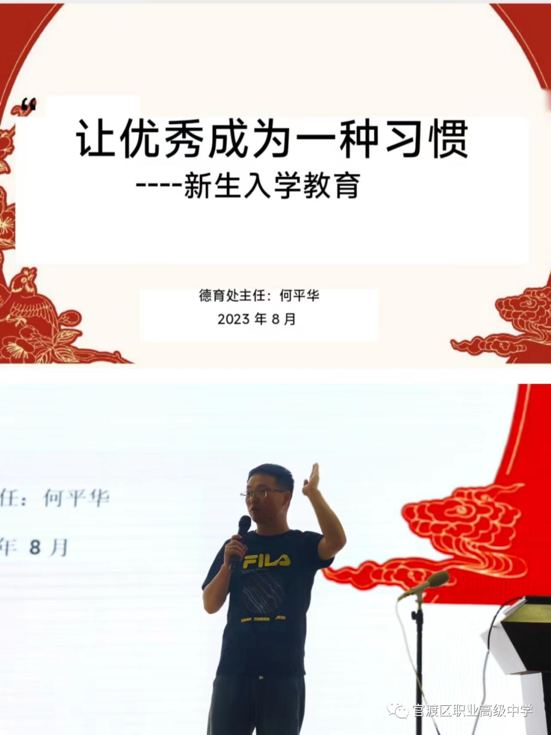 德育处主任何平华以《让优秀成为一种习惯》为主线,围绕何为优秀、让自己变得优秀、做高级自由的人、走青春奋进之路四个方面内容,勉励同学们坚信:在官职群英荟萃的师长们的悉心引导下,在同学们执着奋斗不懈努力之下,23级同学们一定能尽快适应新的学习环境,做好自己的学业规划,以梦为马,踔厉奋斗,为实现自己的美好人生理想打下坚实的基础。