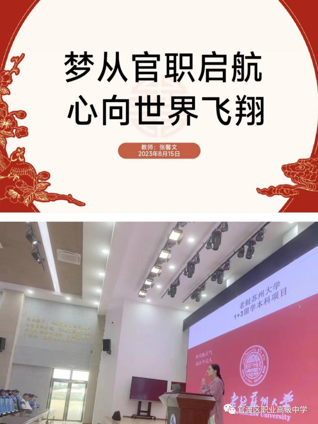 国际交流中心主任张馨文做了以《梦从官职启航 心向世界飞翔》为题的宣讲会。她详细介绍了我校国际班的设置、出国留学的意义、东南亚国家留学的优势,同时还结合自身经验为同学们生动讲述国外经历及见闻,播放往届曾参加此项目影像资料,让同学们对此国际联合培养项目有了更深入的了解。