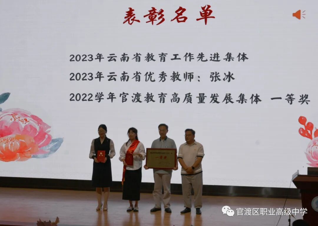在教育这片沃土上,我们从事着太阳底下最光辉的事业,用自己的勤劳和智慧诠释着红烛精神,涌现出一批又一批的优秀教师。他们创造性的劳动不仅是对自己的肯定,也为教育事业的发展作出了卓越的贡献。今天的教师节对获得省级、区级和校级优秀称号的教师进行了表彰,同时学校还获得了2023年云南省教育工作先进集体和2022学年官渡教育高质量发展集体一等奖的好成绩。