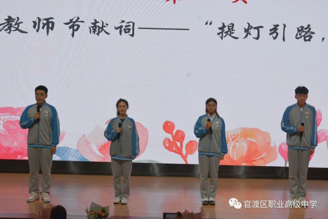 教师节怎能少了学生的祝福,一个人能遇到好老师是人生的幸运,一位好的老师在学生的生命中起着至关重要的作用。教师不仅传授他们知识,还塑造学生的灵魂,让他们逐渐成为最优秀的自己。今天,我们官渡职中的学子,怀揣着对老师们的感恩之心,带来诗歌朗诵《提灯引路,育梦成光》。四位学生在台上包含热情的朗诵,让台下的老师们感动不已。提灯引路,育梦成光,帮助并指引学生走上光明的道路是我们的责任。长风破浪会有时,直挂云帆济沧海,相信未来的某一天,他们定会乘着属于自己的风浪,去书写无比绚烂的人生篇章。