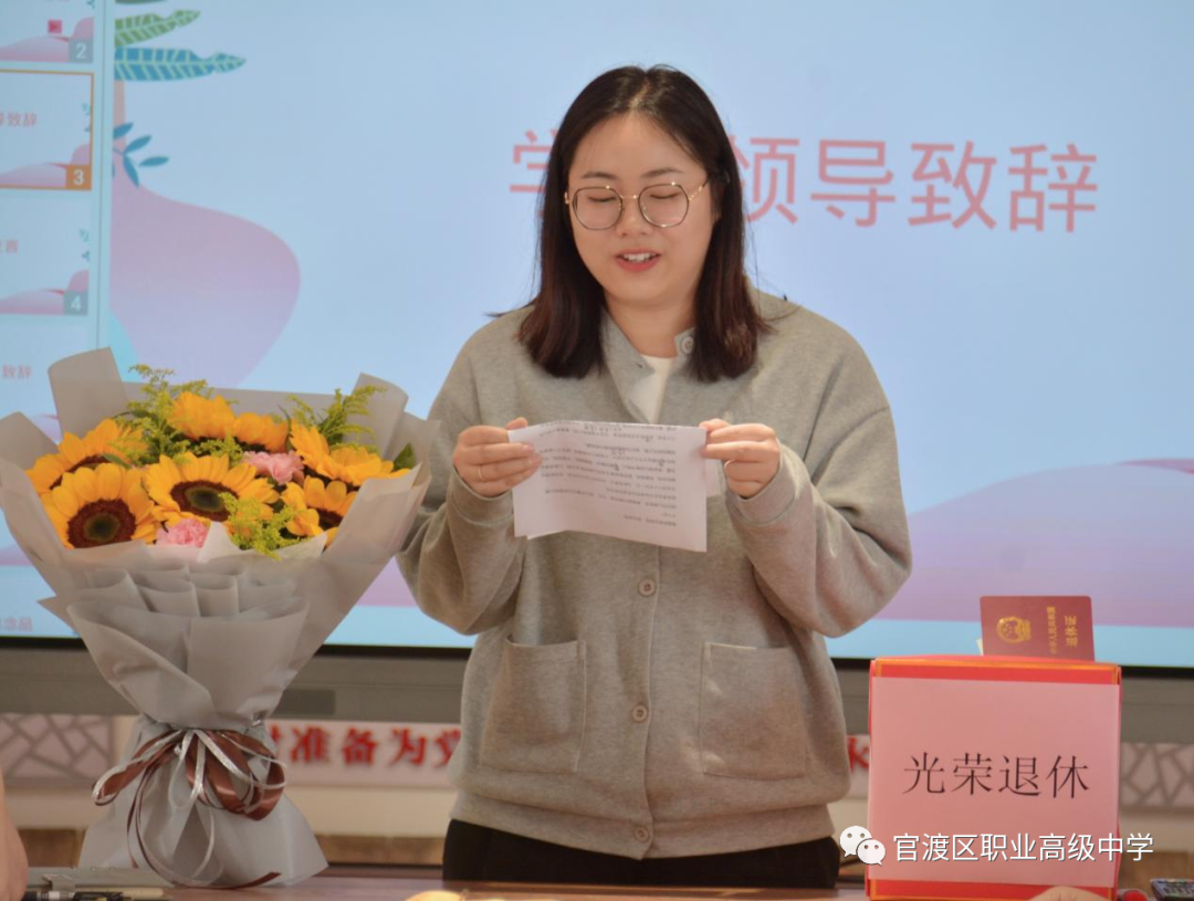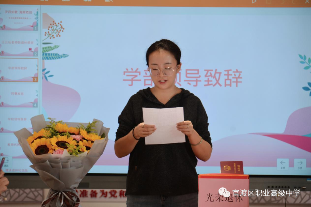 徐志雄副校长、杨燕副校长、杨秋副校长和张冰副校长也做了精彩发言,他们回顾了王老师三十四年的教育生涯和二十四年的班主任经历,高度赞扬了王老师对学校发展的杰出贡献,并强调要继承前辈的光荣传统,带领全校教职工继往开来,努力将学校建设成为云南职业教育的标杆,希望王老师常回来看看。