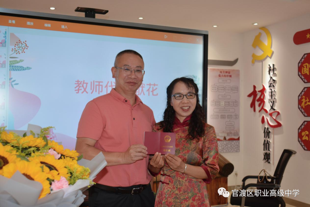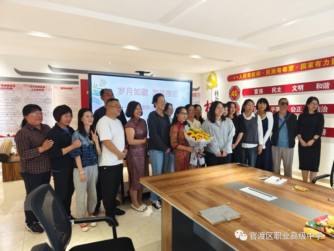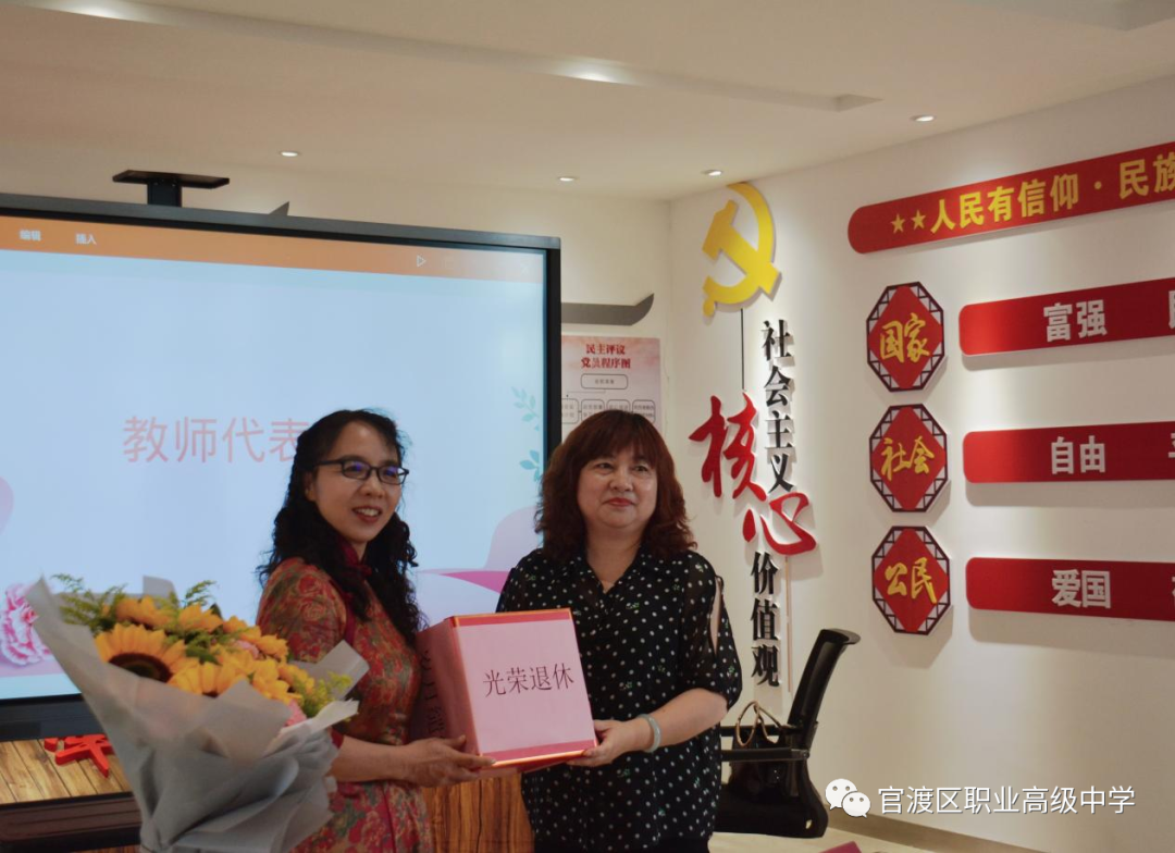 杜玉叶和吕飞两位老师给王老师敬献了鲜花,工会主席郭丽霞老师赠送了纪念品,徐副校长颁发了退休证书,在场的老师们纷纷和王老师合影,留下美好回忆。