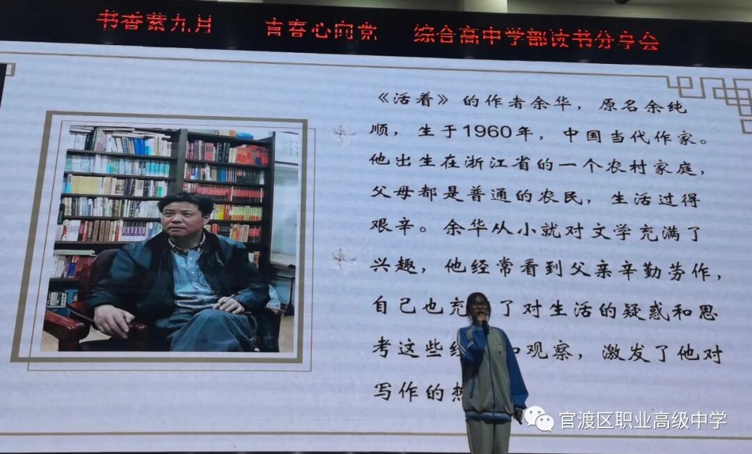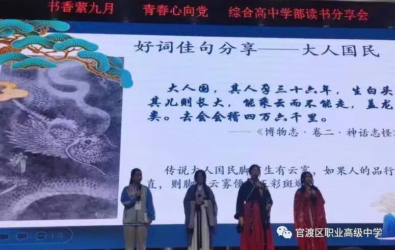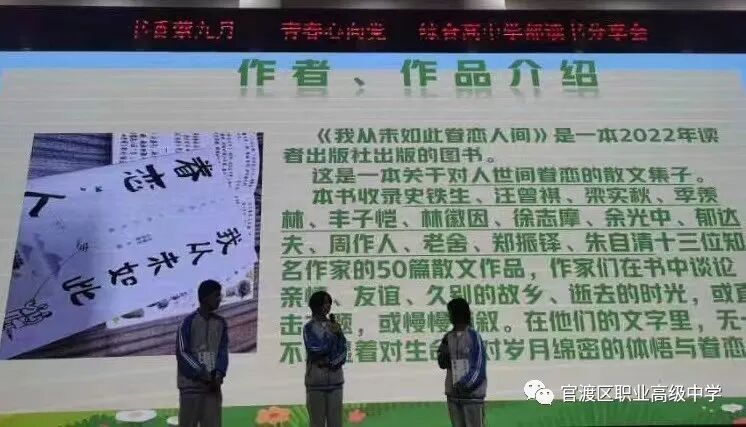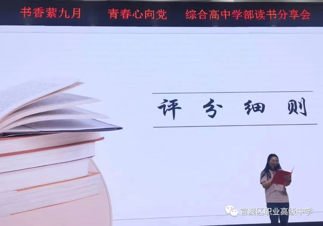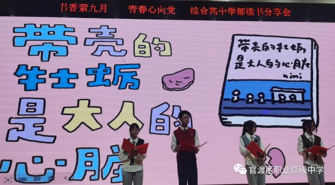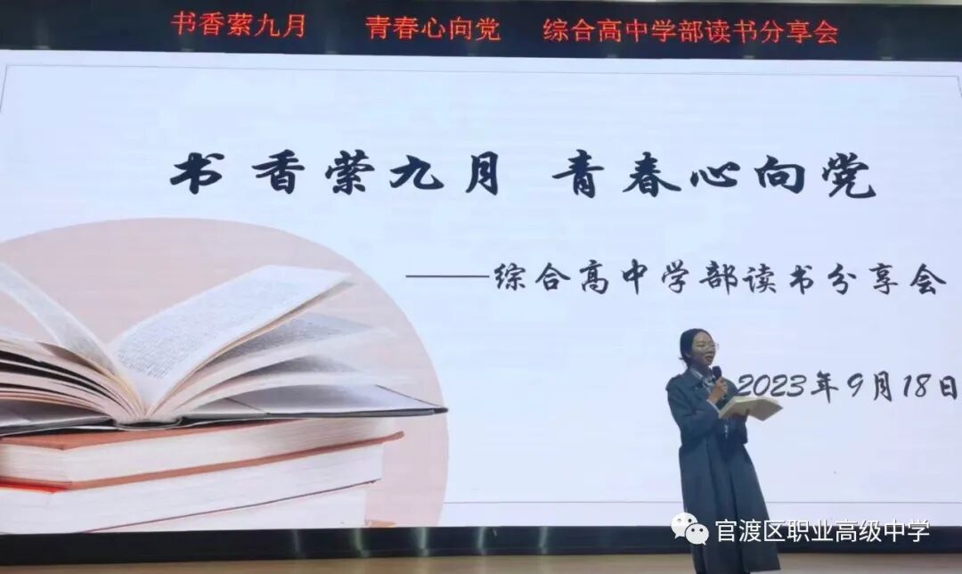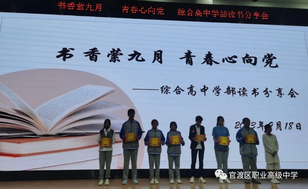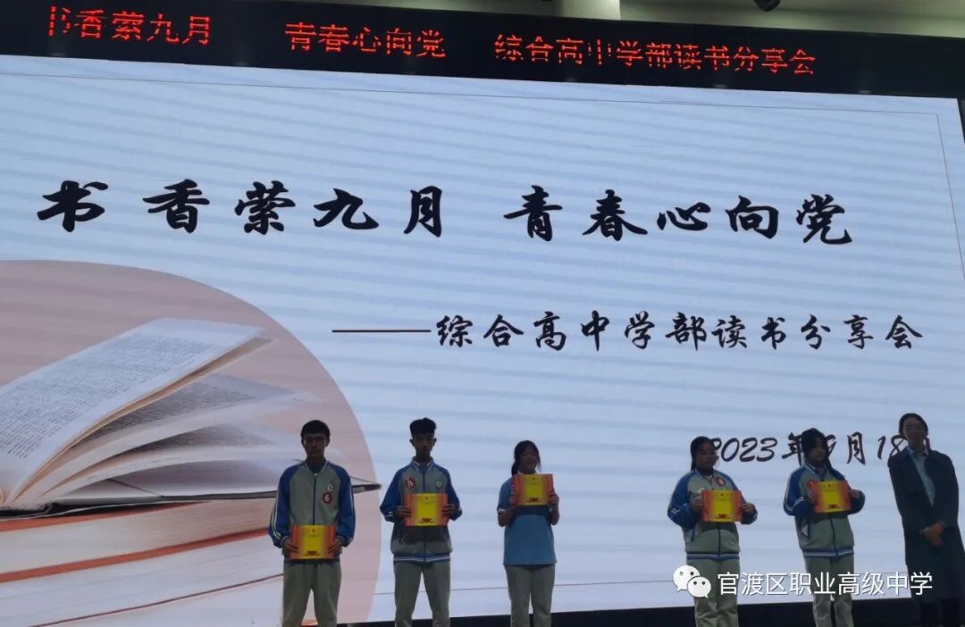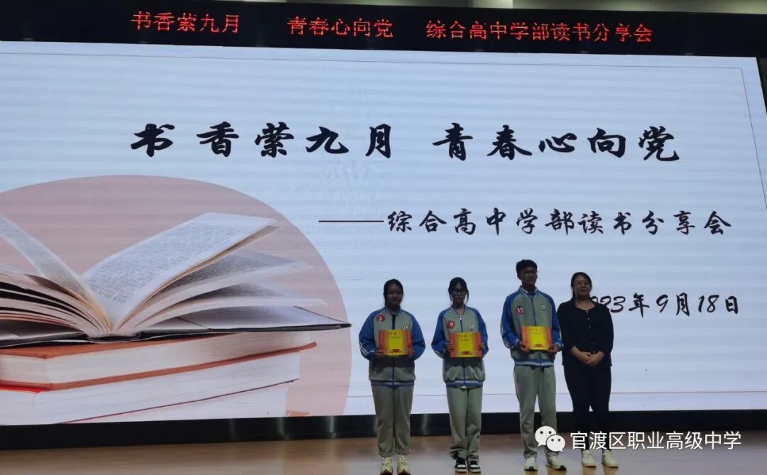 读书如春风化雨,润物无声;读书如耕耘,收获的是未来。为了培养学生读书习惯,丰富学生业余生活,激发学生的阅读积极性,着眼于学生的终身发展,引导学生爱上读书,多读好书,为学生创造书香校园的氛围,昆明市官渡区职业高级中学综合高中学部于9月18日晚在任之厅举办了以“书香萦九月,青春心向党”为主题的学生读书分享活动,在读书分享活动中,老师和同学们共同寻找着“最美朗读者”。