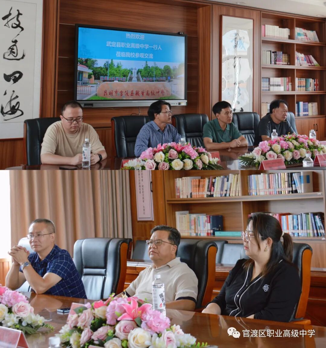 为加强校际间的学习与交流,9月26日,武定县职业高级中学校长付磊、执行校长尤发荣、副校长郭乂嘉、教务副主任吴剑奎一行5人莅临我校参观交流。