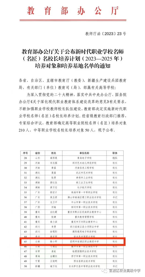 近日,教育部印发通知,公布新时代职业学校名师(名匠)名校长培养计划(2023—2025年)培养对象和培养基地名单。我校路小军校长被列为新时代职业学校名校长培养对象。