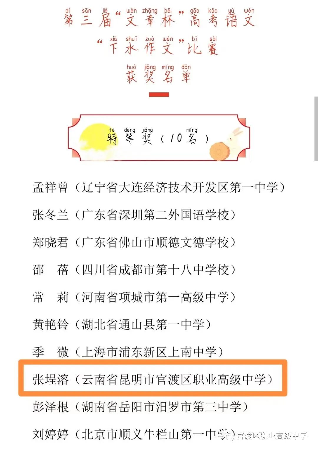 日前,我校语文组15位老师参加了中国文章学研究会、《新作文》杂志社联合举办的第三届“文章杯”高考语文“下水作文”比赛,并获得“特等奖”1个,一等奖4个,二等奖7个,三等奖3个。