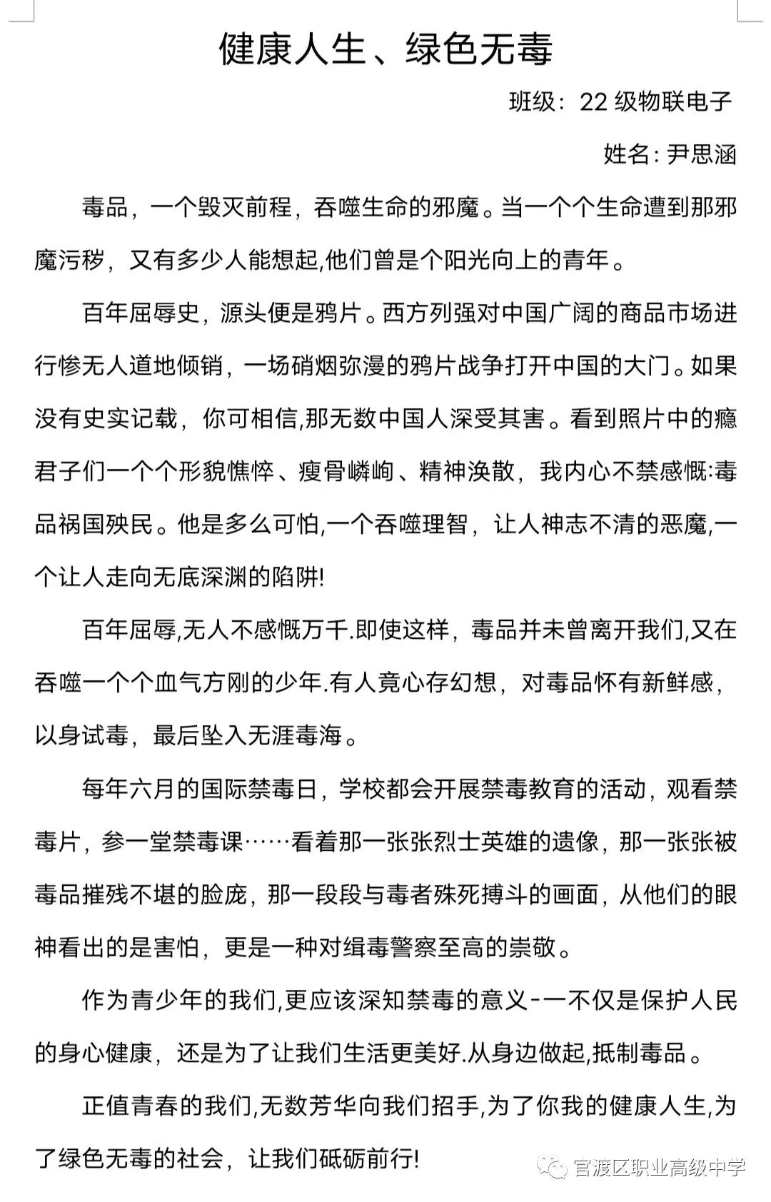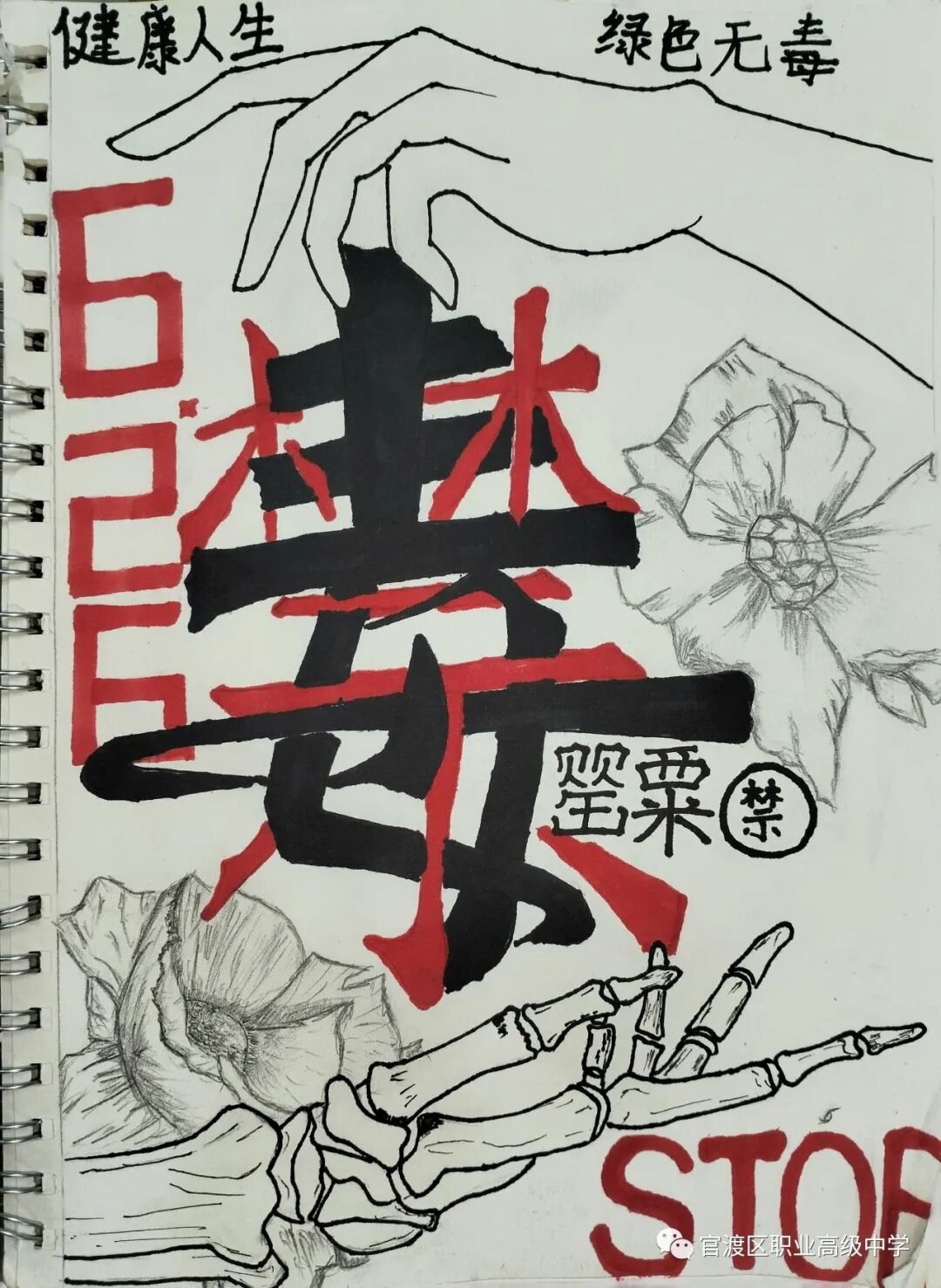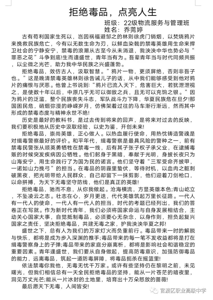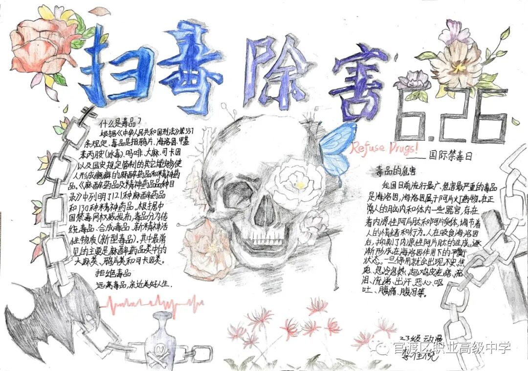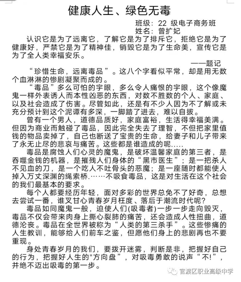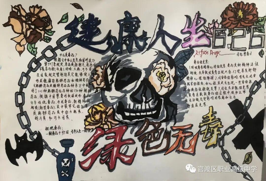 昆明市官渡区职业高级中学团委讯:为深入贯彻落实习近平总书记关于禁毒工作的重要指示精神,进一步巩固学校毒品预防教育成果,增强在校学生识毒、防毒、拒毒意识和能力,全面动员广大青少年群体参与禁毒斗争,推动禁毒预防教育工作,我校团委决定以“健康人生,绿色无毒”为主题开展形式多样的禁毒作品征集比赛活动。