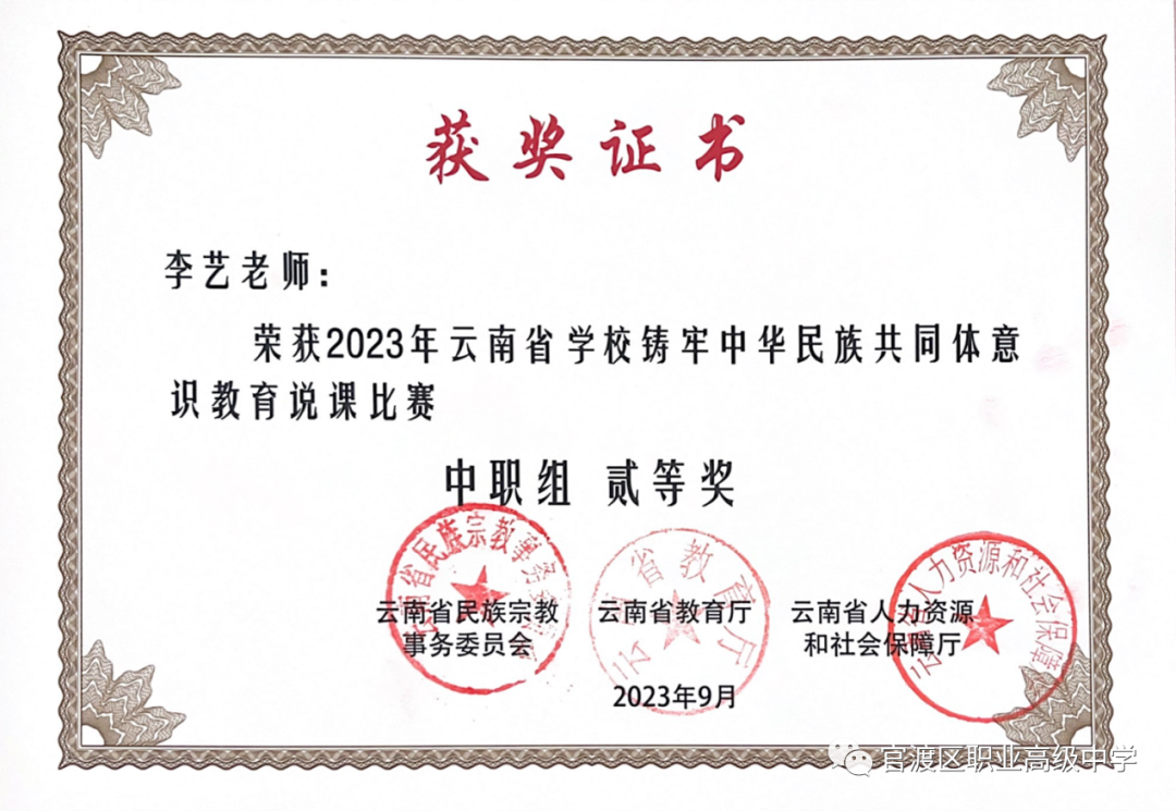 我校政治教研组李艺老师荣获2023年云南省学校铸牢中华民族共同体意识教育说课比赛二等奖热烈祝贺我校政治教研组李艺老师荣获由云南省民委、云南省教育厅、云南省人社厅主办的2023年云南省学校铸牢中华民族共同体意识教育说课比赛二等奖。1END