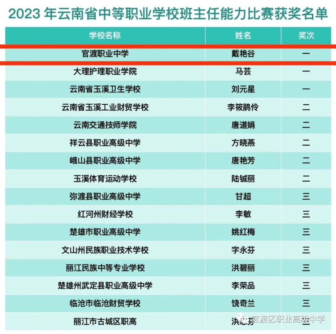我校实施党建引领,构建全员、全程、全方位“三全育人”体系,打造人人都是德育工作者的校园氛围。建立了德育处、思政教研组、德育干事、班主任、课任教师“五级联动”大德育机制,形成包括“全体行政干部、德育干事、班主任、任课教师、工勤人员、后勤服务、合作企业、联动的社区、派出所、社会团体、家长”等共同参与的全员育人,从“新生报到”、“入学教育”到“企业实习”、“毕业典礼”的全过程育人,在“德育管理、教育教学、安全保卫、后勤服务、文化建设、文体活动”等方面实施学生“德、智、体、美、劳全面发展”的全方位育人,做到人人有事干,事事有人干,时时有事干,时时有人干。在2023年云南省中等职业学校“三全育人”典型学校评比中脱颖而出,获此殊荣!我校戴艳谷老师荣获省级中等职业学校班主任能力比赛一等奖。