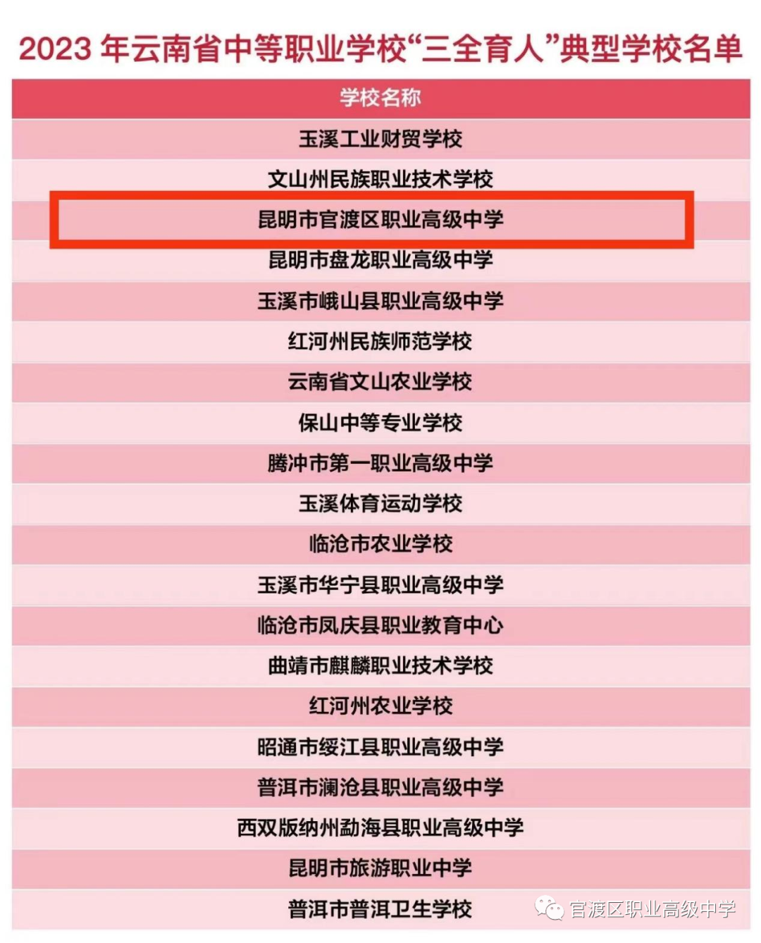 德育处讯:为深入学习贯彻党的二十大精神,围绕建设“大思政”格局,进一步推进全员、全方位、全过程育人,提升新时代高校思想政治教育工作成效,展示一批优秀“三全育人”典型案例,近日,云南省教育厅发布《关于2023年中等职业学校“三全育人”典型学校等评选结果的公示》。