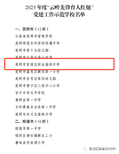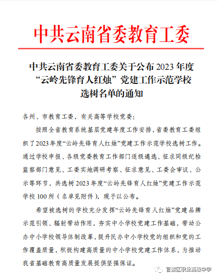 按照全省教育系统基层党建年度工作安排,省委教育工委组织了2023年度“云岭先锋育人红烛”党建工作示范学校选树工作。通过学校申报、各级党委教育工作部门逐级遴选、征求同级纪检监察部门意见、工委实地调研考察、征求意见、工委会审议、公示等环节,我校成功创建为2023年度“云岭先锋育人红烛”省级党建工作示范校!