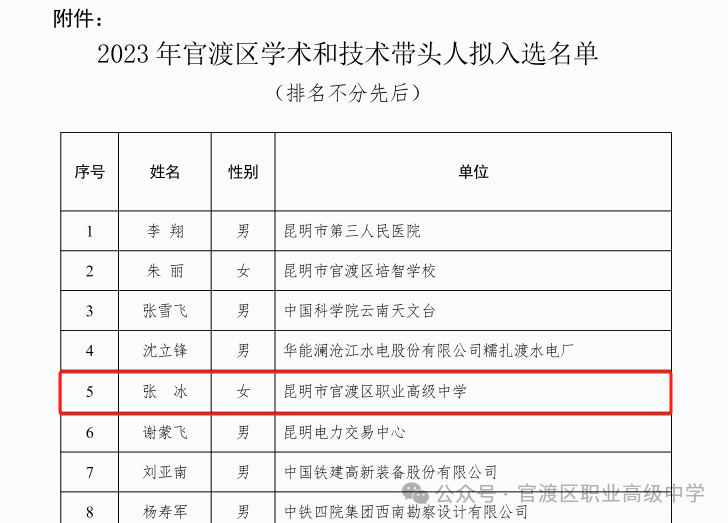 近日,官渡区人民政府根据《中国(云南)自由贸易试验区昆明片区(官渡区)学术和技术带头人选拔培养考核管理办法》(官政规〔2021〕4号)的相关规定,对入选2023年官渡区学术和技术带头人的15人名单进行公布,我校张冰副书记获评“2023年官渡区学术和技术带头人”。