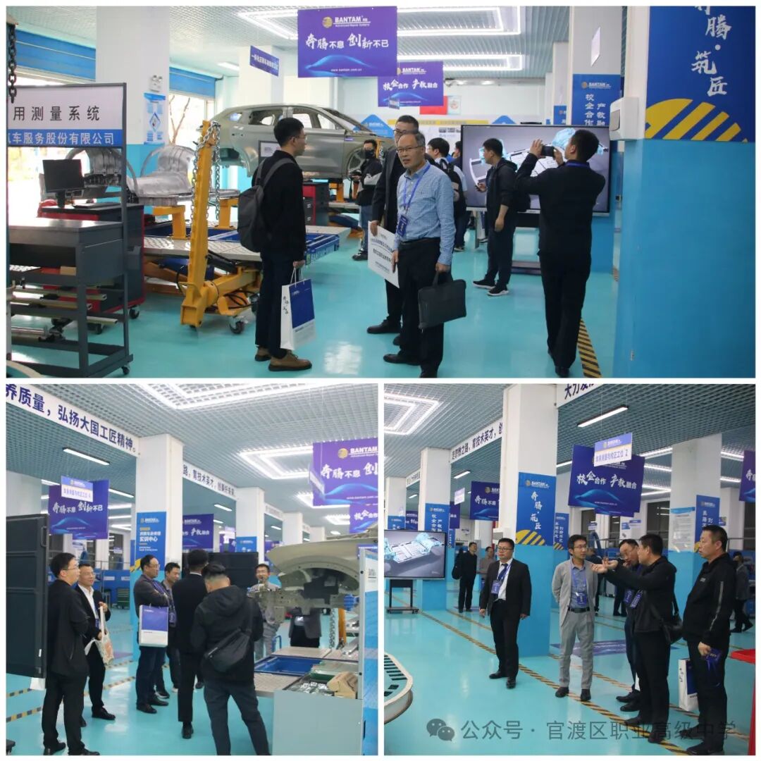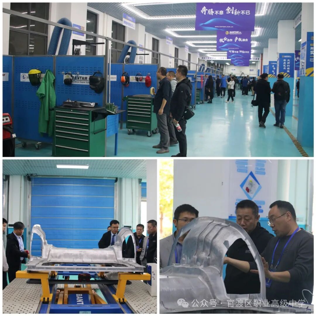 最后,汽车工程学部教师组织与会嘉宾参观了学校内的奔腾实训中心,奔腾师资培训学院张院长对漆面抛光及保护膜贴装、金属件手工制作、铝车身修复、车身校正、一体式压铸车身维修等工位进行了详细讲解。这些设备具有先进的技术和高效的功能,能够满足学生在实际车身修复中的各种需求,为专业教师们提供了一个实践学习的平台。