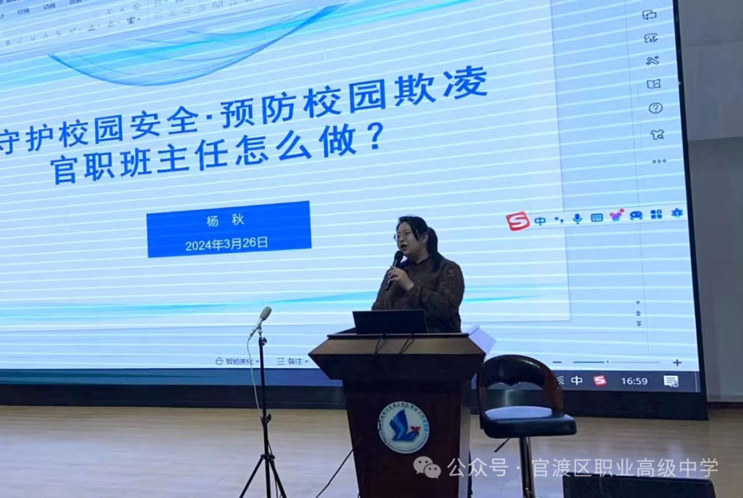 最后,杨秋副校长以《守护校园安全 预防校园欺凌——官职班主任们怎么做?》为主题进行讲话。过程中,杨副重点从校园欺凌方面知识进行分析,讲解了什么是校园欺凌,列举了校园欺凌者的典型特征以及容易被欺凌的学生群体,以及校园欺凌的预防及应对措施,针对欺凌事件的法律责任、事件判定、预防校园欺凌的方法也进行了阐述。