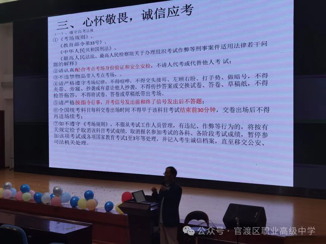 最后,冷部长强调出考场后坚决不对答案,不问、不听,即便听到也要坚信自己。此外,他号召学生在考试期间注意文明礼仪,彰显官职风采。讲座结尾,他祝愿高三学子旗开得胜,圆梦高考,金榜题名,再创辉煌!