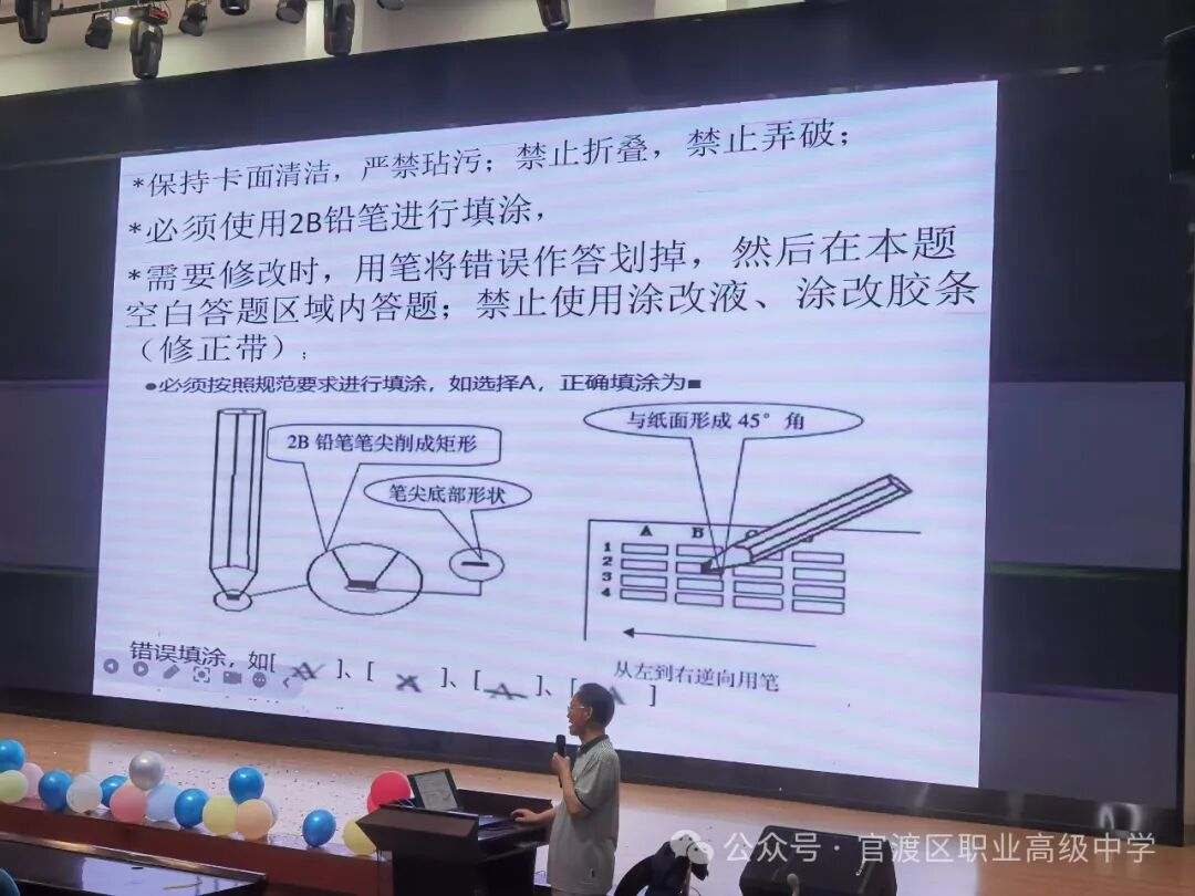随后,冷部长梳理了考试时间节点。1.提前30分钟入场,通过广播熟悉考场规则。2.考前15分钟分发答题卡、草稿纸,考生检查答题卡破、污、漏、缺,并阅读答题卡上的注意事项,在答题卡上填写自己的姓名和准考证号,并仔细检查确保无误。3.考前10分钟,监考员启封试卷袋。4.考前5分钟,分发试卷,只能看卷,绝对不能动笔答题。5.考点开考铃声响起