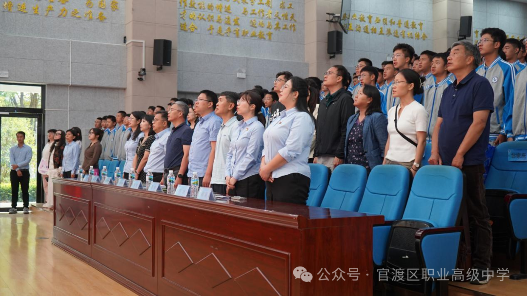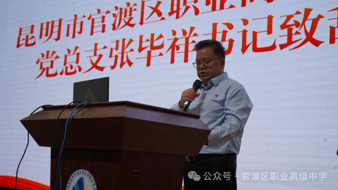 官渡区职业高级中学校长助理、汽车工程学部部长黄孜君老师主持会议。仪式伊始,全体起立,奏唱国歌。全体师生精神饱满,信心满怀地齐唱校歌、齐诵教师誓词与学生誓词。随后,官渡区职业高级中学党总支书记张毕祥、昆明理工大学城市学院院长周荣锋先后发表致辞。