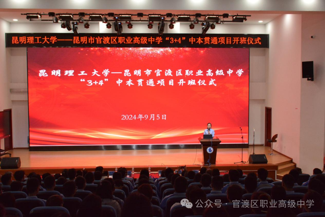 金秋送爽丹桂香,中本贯通谱新章。2024年9月5日上午10点,昆明理工大学与官渡区职业高级中学“3+4”中本贯通项目开班仪式在官渡区职业高级中学任之厅举行。昆明理工大学城市学院领导班子、学院汽车服务工程专业教师团队、官渡区职业高级中学全体行政、“3+4”中本贯通班全体科任教师、全体同学及家长代表出席此次开班仪式。