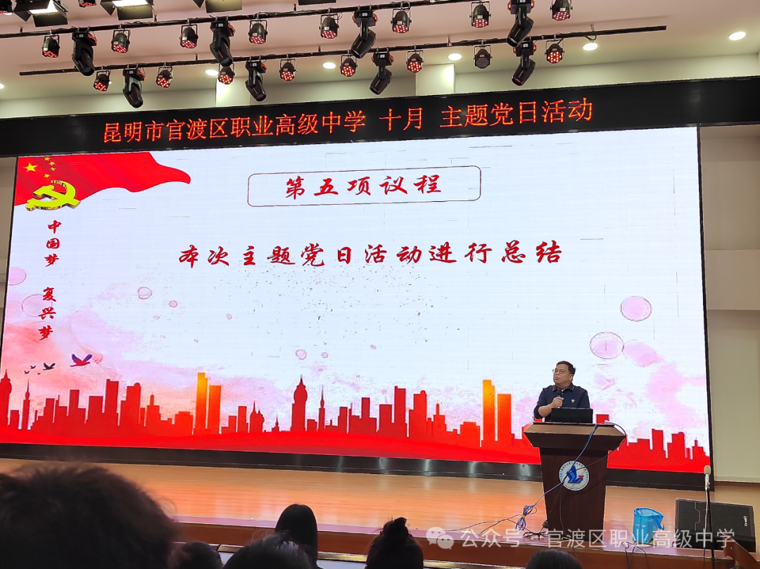 最后,昆明市官渡区职业高级中学教育集团校长张毕祥同志的总结发言,为我们在座的每一位党员指明了未来学校教育发展的道路。全体党员教师将携手并进,深入学习党的创新理论,不断提高政治判断力、政治领悟力、政治执行力,助力学校教育高质量发展。