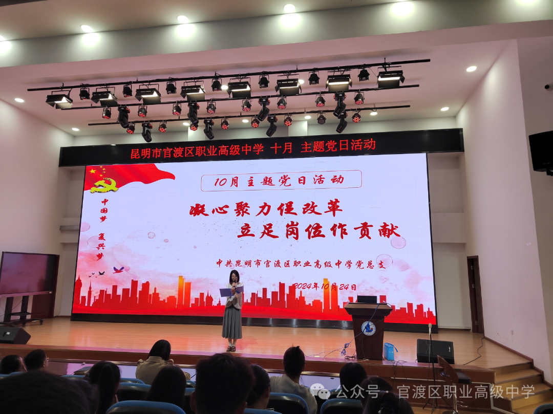 国庆,承载着祖国的历史记忆与成就辉煌。我们伟大的新中国成立的第75年,党的十八大以来,在以习近平同志为核心的党中央坚强领导下,中华民族以其坚韧不拔、勤劳勇敢和团结奋进的精神气概,书写了一部部壮丽的篇章。75年肝胆相照,75年荣辱与共。在新的历史条件下,我们要深入学习党的创新理论,不断提高政治判断力、政治领悟力、政治执行力,确保我们的思想和行动始终与党中央保持高度一致。2024年10月24日,昆明市官渡区职业高级中学党总支开展了10月“凝心聚力促改革,立足岗位作贡献”的主题党日活动。