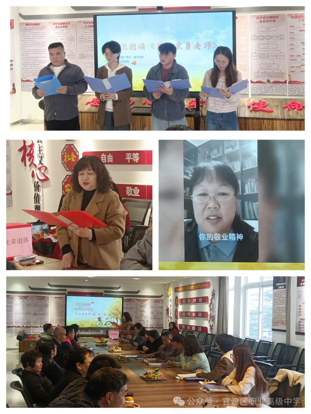 接下来由崔雄兵、邵建秋、吴艺和刘燕等四位老师带来了诗歌朗诵《致陈家勇老师》,深情地道出了对陈老师的浓浓眷念。