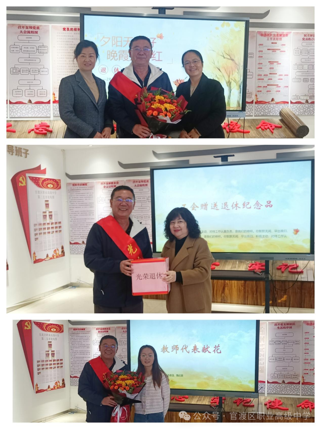 教师代表刘燕敬献了献花,工会主席郭丽霞赠送退休纪念品。