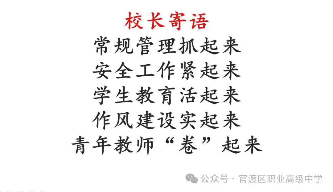 会议的最后,冷部长以杨燕校长的五句话作为总结,即“常规管理抓起来”、“安全工作紧起来”、“学生教育活起来”、“作风建设突起来”、“青年教师卷起来”。冷部长尤其强调了年轻教要多参加课赛,多写论文,多做课题,多编教辅,加强自身的全面发展。