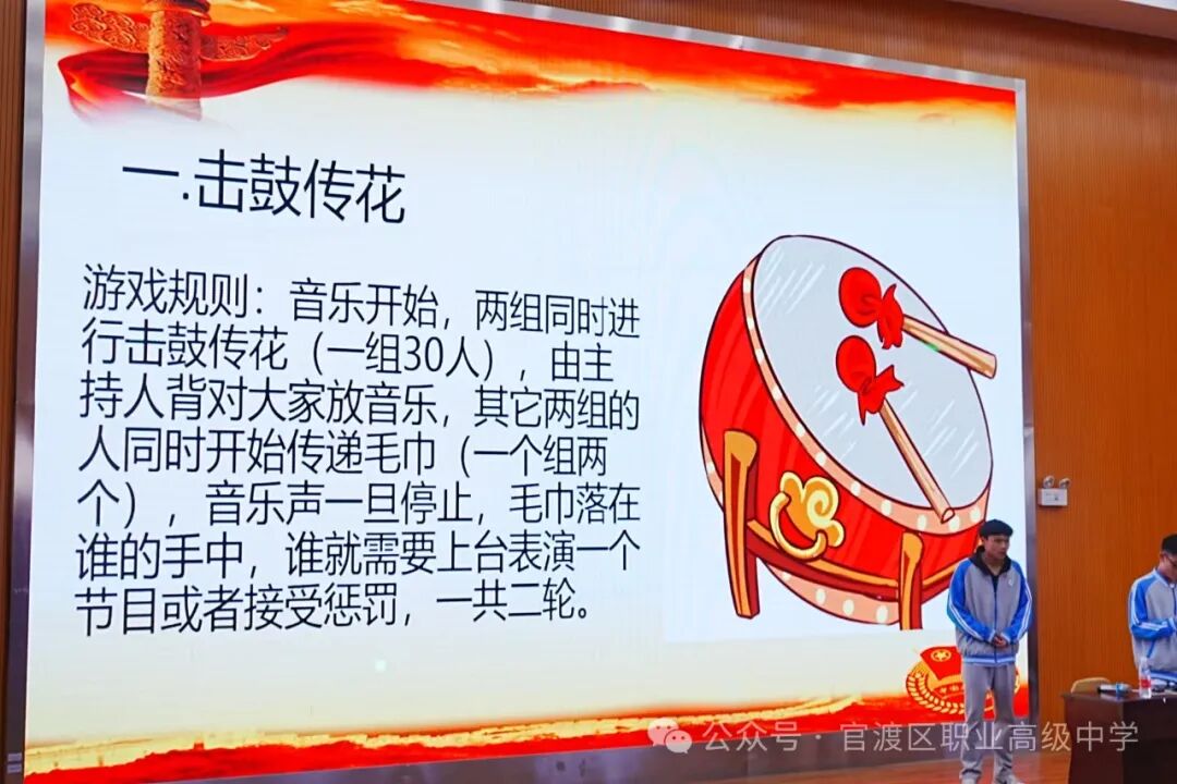 本次活动由贾正阳、宋娜娜主持,共有四个环节。第一个环节首先由贾正阳带领所有人齐唱团歌,接着丁俊辉带领大家宣读入团誓词。为了快速让团员们熟络起来,积极加入到活动中来,第二个环节,宋娜娜带领团员们玩起击鼓传花的游戏。所有人分为两组,每组一个话筒,音乐响起,游戏开始,2个话筒在团员们的手中快速传递,随着音乐的此起彼伏、跌宕回旋,团员们都表现出了心跳加速、摩拳擦掌的紧张氛围,眼中尽是期待与兴奋。三轮击鼓传花结束后,共选出六位拿着话筒的团员上台接受惩罚,六位团员跳着惩罚的舞蹈将团员们逗得捧腹大笑。轻松愉快的氛围将团员们的关系拉近了一步,彼此间有了更多的沟通与交流,没有了初始的生疏与客气。
