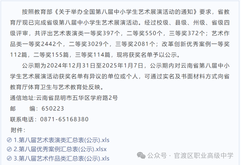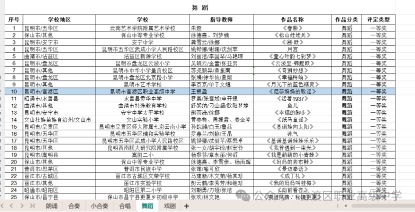 我校舞蹈团荣获云南省第八届中小学生艺术展演舞蹈比赛一等奖!我校舞蹈团荣获云南省第八届中小学生艺术展演舞蹈比赛一等奖!学生发展中心:“绽放艺术风采 激发强国力量”三年一届,全省规格最高、规模最大、影响最广的中小学美育标志性品牌——云南省第八届中小学生艺术展演活动2024年11月21日 - 28日在昆明大剧院举行!此次活动吸引了来自覆盖16个州市,参与师生多达15万人次。共有艺术表演类1365个、作品7654幅、优秀成果381个。在本届展演中,我校舞蹈《尼莎妈妈的歌谣》从众多优秀作品中脱颖而出,获得舞蹈展演一等奖!我校一直高度重视学生的艺术教育与全面发展,积极组织学生参与此次展演活动。其中,舞蹈《尼莎妈妈的歌谣》经过师生们的精心编排与刻苦排练,在众多优秀作品中脱颖而出。舞台上,同学们用优美的舞姿、真挚的情感,将《尼莎妈妈的歌谣》中的文化内涵与艺术魅力展现得淋漓尽致,赢得了评委与观众的一致认可。此次获奖,不仅是对我校参演学生艺术才华的高度肯定,更是对学校长期以来坚持美育教育的有力褒奖。学校将以此次荣誉为契机,进一步加强美育工作,为学生提供更多展现自我、提升艺术素养的平台,培养德智体美劳全面发展的社会主义建设者和接班人,让艺术之花在校园里绽放得更加绚烂多彩,为激发强国力量贡献教育力量。附:指导教师和参赛学生名单来源|学生发展中心作者|陈晓艺/文字 王园园 周鹏/图片 排版|王园园责编|王园园审核|郜 猛1END