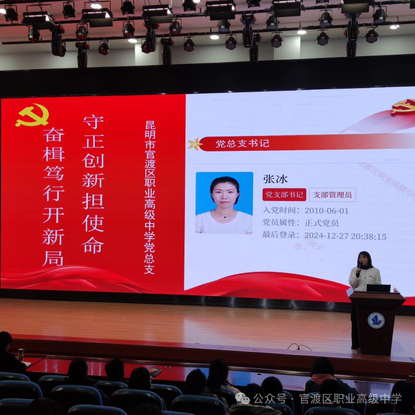 为深入贯彻落实省委、市委、区委全会精神,在新的一年开好局、起好步、谋好篇,奋力开创经济社会高质量发展新局面,2025年1月6日下午15:30,昆明市官渡区职业高级中学党总支开展了“守正创新担使命 奋楫笃行开新局”主题党日活动。会议伊始,由党总支书记张冰同志带领全体党员重温入党誓词。随后全体党员一起观看习总书记2025年新年贺词,由孙存蔚同志分享新年贺词学习感悟。接着,由王芹艳同志带领全体党员学习了-《习近平文化思想学习纲要》、观看写好春“廉”,过好春“洁”---春廉教育片、郜猛同志带领大家学习了春节前党风廉政教育之《中国共产党廉洁自律准则》及《中国共产党纪律处分条例》。《准则》为党员和党员领导干部树立了一个看得见、够得着的高标准,展现了共产党人高尚的道德追求。《条例》则是划出了党组织和党员不可触碰的底线。它详细规定了各类违纪行为及其相应的处分措施,内容全面且细致,涵盖了政治纪律、组织纪律、廉洁纪律、群众纪律、工作纪律和生活纪律等各个方面。学习结束后,由第一党支部第二党小组李波同志、熊永同志、缪希同志、古嬿群同志、张红梅同志带来了剪纸窗花展演。剪纸窗花是传统民间艺术,在春节等喜庆场合常见,有烘托氛围、表达美好愿望的作用。在剪纸窗花展演结束后,进行了庄重又温馨的环节---为党员教师过政治生日,忆初心使命。由党总支张冰书记为四位过政治生日的党员林志刚同志、李红艳同志、尹建华同志以及杨继娟同志送上了“政治生日贺卡”同时邀请杨继娟同志作为代表发表了生日感言,杨继娟同志在发言,过程中回顾了自己的入党历程和在党的教育事业中的成长历程。她鼓励党员们不要忘记入党的初心,牢记党员的身份和使命,在自己的岗位上发挥先锋模范作用。随后,全体党员起立,同唱校歌《我要飞翔》。最后,张冰同志对本次主题党日活动进行总结发言:“我们从来都是在风雨洗礼中成长、在历经考验中壮大,大家要充满信心”引用了习近平总书记的话,表示2024年昆明市官渡区职业高级中学迎来了诸多的困难与挑战,但在这种困难与挑战面前,我们齐心协力、迎难而上,取得了不错的成绩。鼓励所有的党员同志们在未来的2025年不怕困难、不惧挑战、勇往直前。