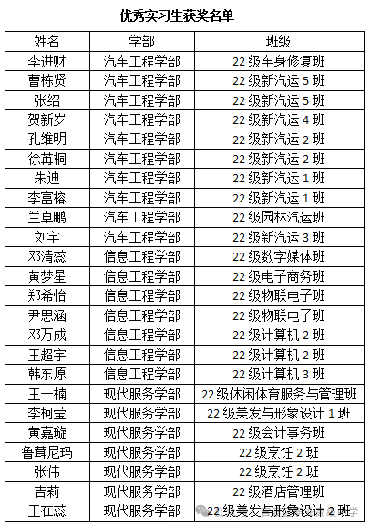 为进一步推动产教融合,促进职业教育的发展和锻炼学生的动手能力。将学习到的理论知识用于实践之中,让学生与社会接触,了解社会所需,加深对社会的认识,增强对社会的适应能力。学校在 2024 年由人才发展中心组织 2022級部分班级进行了岗位实习。在这次实习过程中涌现出一批工作认真、勤奋好学、踏实肯干,严格遵守实习单位各项规章制度;未曾出现过无故缺勤、迟到早退现象,能与公司同事和睦相处,表现出良好的个人形象和素养,受到实习单位一致好评的同学。经过学校、实习单位及实习管理老师共同评定以下同学获得“优秀实习生”称号, 祝愿同学们在不久的将来,成为行业的精英,成为家长的骄傲,成为官渡职中的骄傲。优秀实习生风采