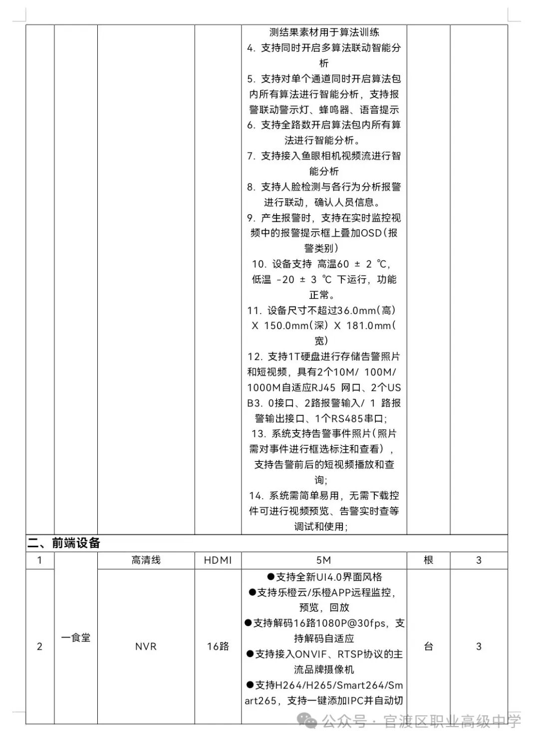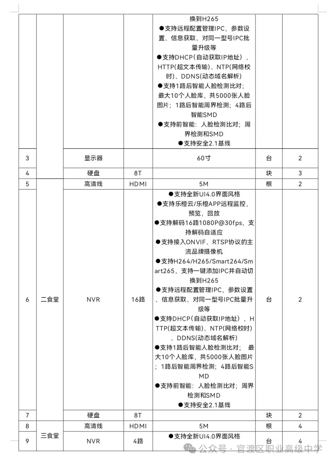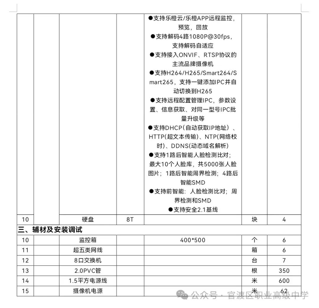 昆明市官渡区职业高级中学食堂明厨亮灶改造采购项目招选供应商事宜已获学校批准,项目资金来源为其他资金,招标人为昆明市官渡区职业高级中学,本项目已具备招标条件,招标方式为询价比选。(一)项目名称:昆明市官渡区职业高级中学食堂明厨亮灶改造采购项目。(二)项目概况:项目预算 30000 元,为视频监控系统应实现对学校食堂厨房区域的全面监控,确保食品加工、烹饪、储存等关键环节的安全与卫生。系统应具备高清画质、实时监控、数据存储与回放等功能,以满足食品安全监管和师生监督的需求。(四)预算金额:30000 元。本次报价不得超过上述预算,否则对采购供应商的报价文件作无效投标处理。询比供应商是指向采购人提供货物的法人、其他组织或者自然人。以下简称供应商。合格的供应商应符合政府采购法第二十二条规定的基本条件。1.供应商具有独立承担民事责任能力,提供法人或其他组织的营业执照等证明材料、自然人的身份证明;2.供应商具有良好的商业信誉和健全的财务会计制度,提供2022年度至今任意一年度的审计报告或财务报表(财务报表包含但不限于资产负债表、现金流量表、利润表)(若成立不足一年的企业则提供成立至今的财务会计报表;新成立的公司或自然人如无法提供相关材料,可提供基本账户的银行资信证明或者资金证明文件;若为个体工商户参与询价,则通过书面承诺满足政府采购法第二十二条规定);3.具有履行合同所必需的设备和专业技术能力的承诺或证明材料;4.供应商有依法缴纳税收和社会保障资金的良好记录,提供2023年9月至今期间的任意1个月的缴纳税收和社会保障资金的相关证明材料(新成立的公司按实际成立时间提供,若成立不足一月,可提供其他材料进行说明;依法免缴的,应提供依法免缴的相关证明文件;若为个体工商户参与询价,则通过书面承诺满足政府采购法第二十二条规定);5.参加政府采购活动前三年内,在经营活动中没有重大违法记录(指供应商因违法经营受到刑事处罚或者责令停产停业、吊销许可证或者执照、较大数额罚款等行政处罚);6.其他条件:截至响应文件递交截止时间,参加项目的供应商未被“信用中国”(www.creditchina.gov.cn)列入失信被执行人、重大税收违法失信主体、政府采购严重违法失信行为记录名单,未被中国政府采购网(www.ccgp.gov.cn)列入政府采购严重违法失信行为记录名单。(查询结果以采购人查询结果为准)。(二)技术要求