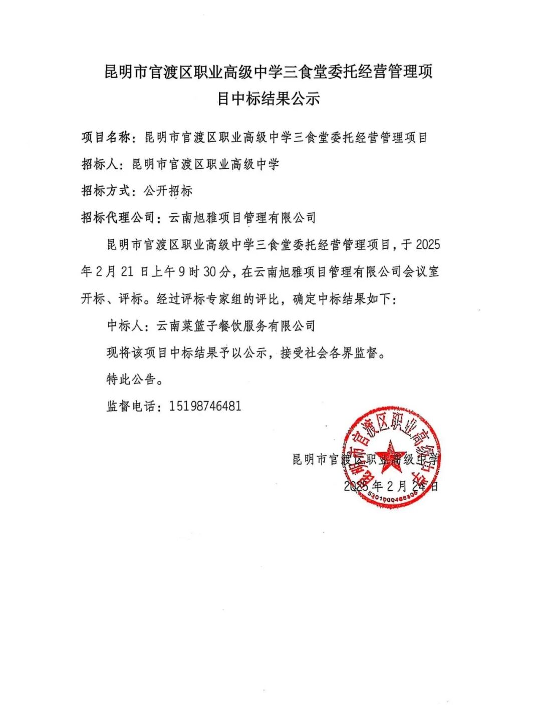 昆明市官渡区职业高级中学三食堂委托经营管理项目中标结果公示