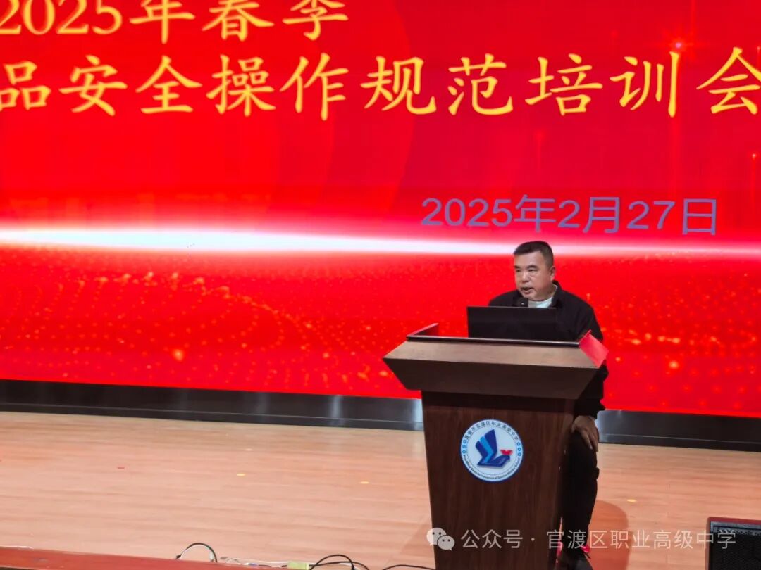 2025年春季学期伊始,为进一步加强学校食品安全管理,确保广大师生的饮食健康与安全,官渡区职业高级中学于2025年2月27日组织召开春季从业人员食品安全操作规范培训会。本次培训由学校食品安全督导检查部邵建秋部长主讲,全体食堂工作人员积极参与,共同学习食品安全知识,提升操作技能。