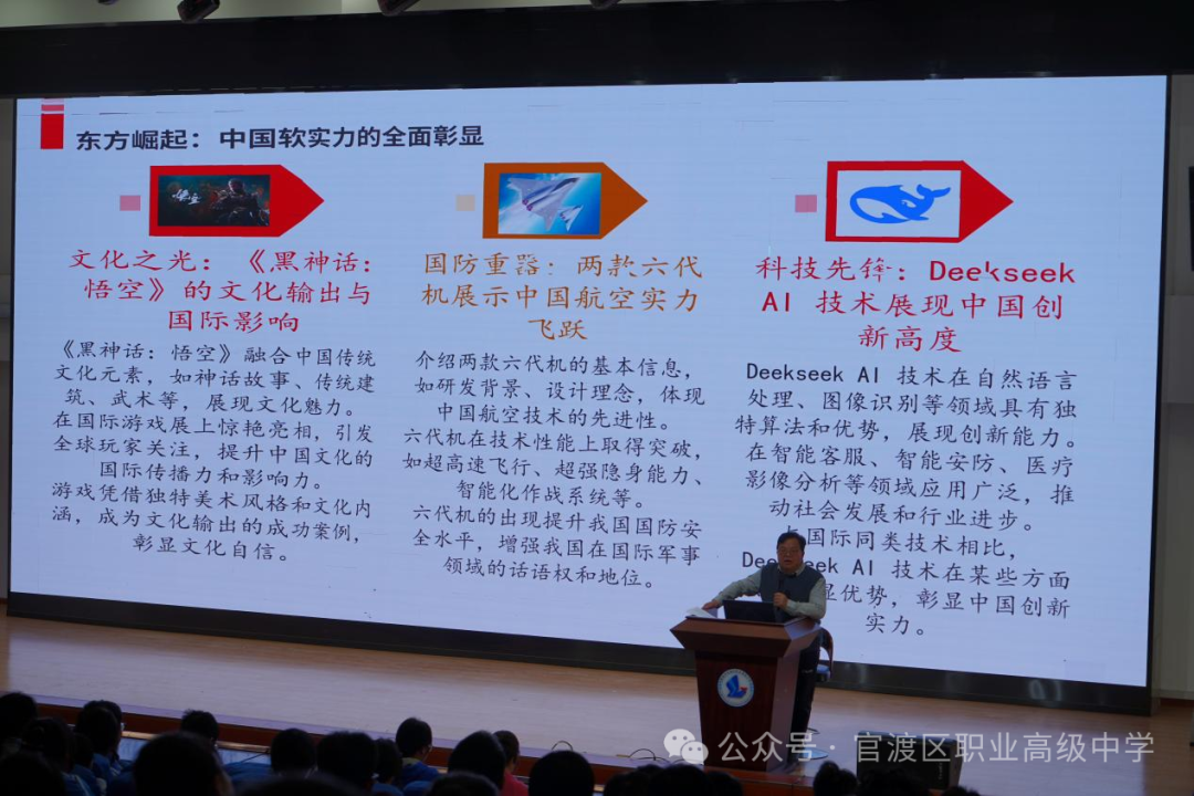 张总校以“时代浪潮:千年未有之大变局”为切入点,结合党的创新理论和国家发展战略,深入剖析了当前国际国内形势。从人工智能技术的飞速发展、俄乌战争对全球格局的影响,到国产六代机与Deepseek AI技术彰显的中国创新实力,张总校通过详实案例,强调新时代青年要紧跟党引领,主动融入国家发展大局。他指出,党的科技强国、文化自信战略为青年成长提供了广阔舞台,团员们应坚定“四个自信”,勇担时代使命。