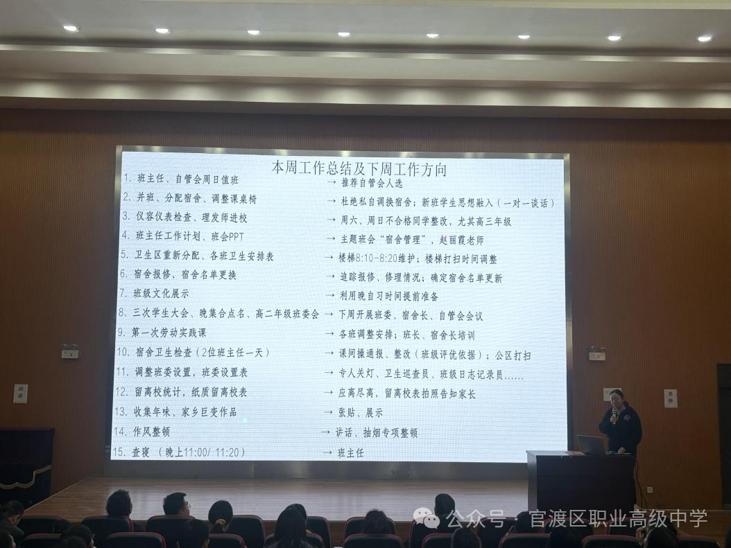 最后,德育干事戴艳谷老师对近两周的班主任工作进行了总结并强调了下周的工作重点。戴老师强调,班主任要制定“班级公约”和“德育学分补分行动计划”,丰富班级管理手段。建议班主任们在制定过程,充分征求学生的意见,让学生们参与到班级管理中来,既提高学生的参与性,又能使班级公约更加贴合实际,易于执行。最后,戴老师讲述了班主任们晚上查寝到凌晨的辛苦和不易,她提到很多班主任仍在带病坚持工作,请老师们一定要保重身体,注意休息。